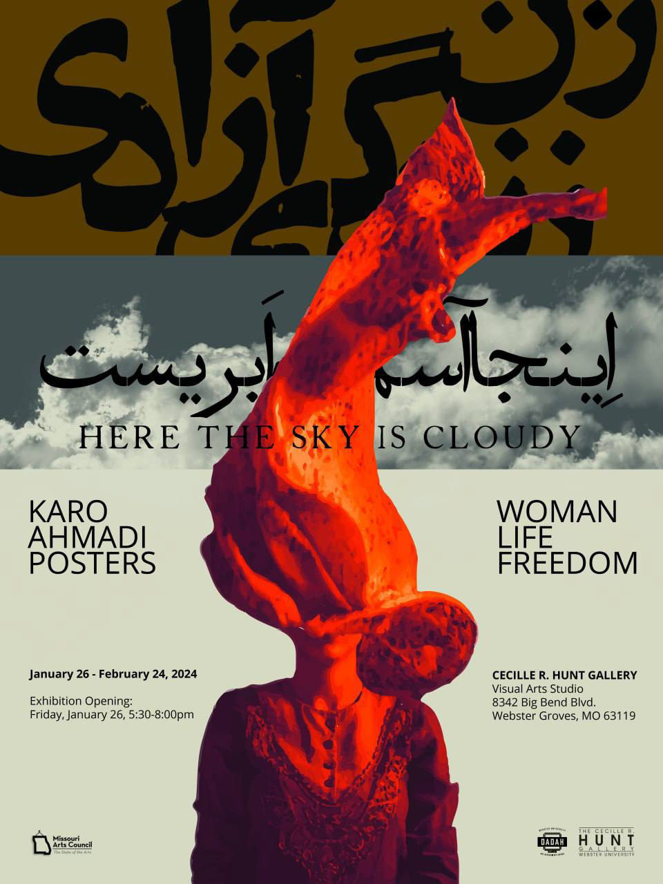 Karo Ahmadi, an assistant professor of graphic design, has dedicated the last ten years to using poster art as a medium to express a powerful and resonant voice in cultural and political spheres. This exhibition, "Here the Sky is Cloudy," is a culmination of Karo's journey, showcasing the poster's vital role in visual communication and its impact on societal discourse, particularly focusing on the Women, Life, Freedom movement in Iran.